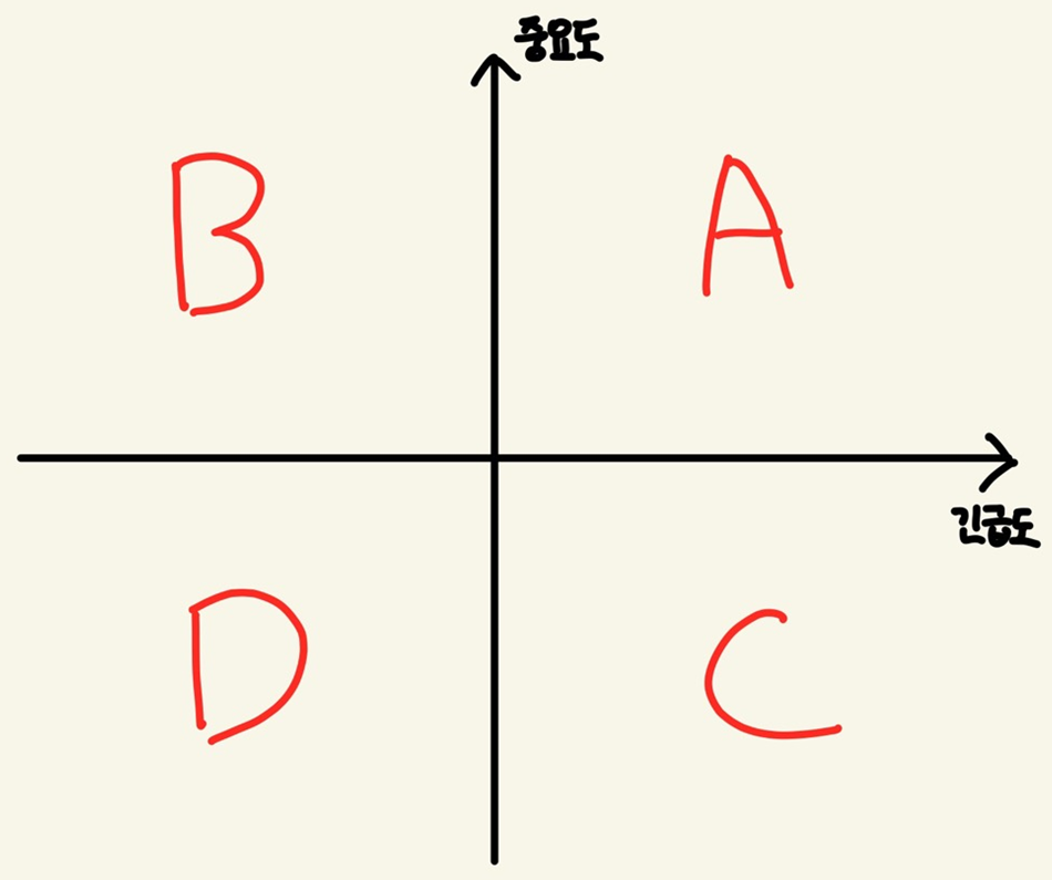 - 중요도와 긴급도를 축으로 4사분면을 나누고 우선순위를 세워보자