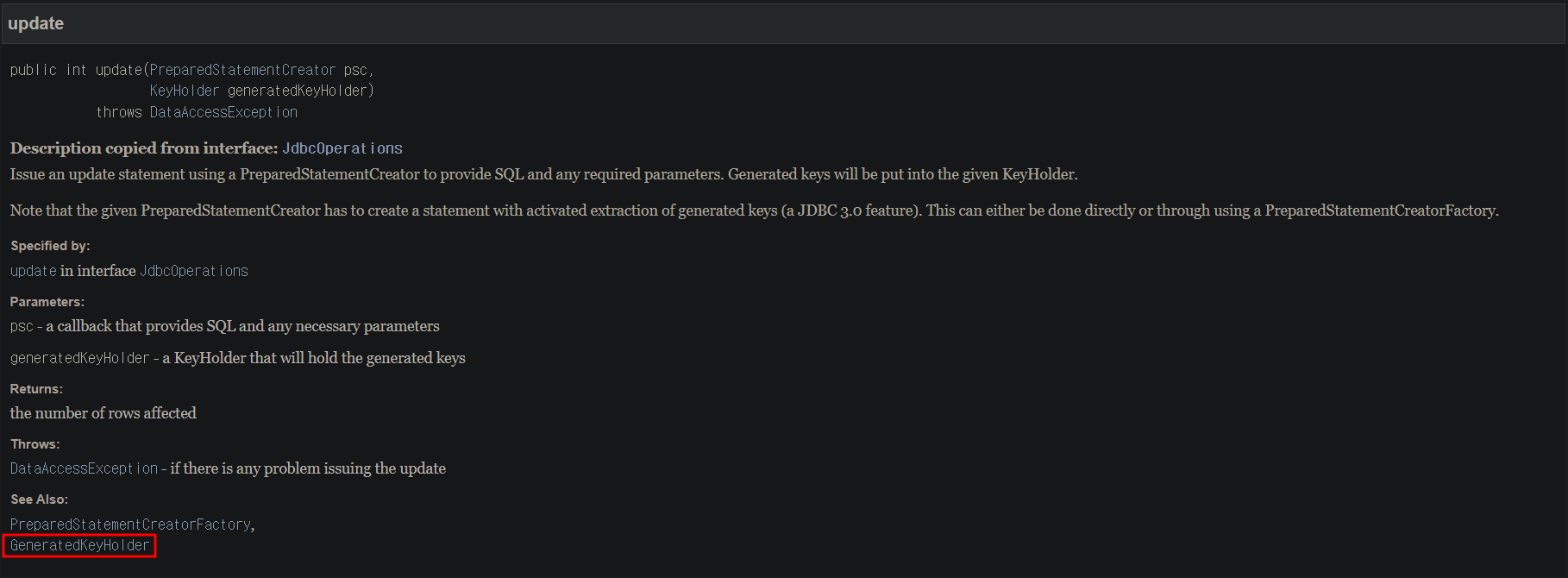 필자는 본문에 서술한 방식으로 GeneratedKeyHolder라는 구현체를 알게 되었으나 다음과 같이 update 메서드 명세 부분에 맨 아래 부분을 보면 GeneratedKeyHolder에 대한 링크가 걸려있음을 확인할 수 있다. 어떻게든 사용자에게 구현체가 이미 있다는 사실을 노출시키려는 스프링 제작자들의 마음을 알아주도록 하자...!