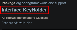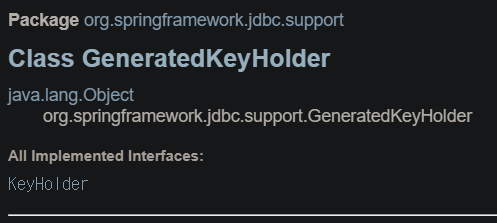 KeyHolder 클래스는 인터페이스라는 것을 알게 되었다. 그러면 우리는 update 메서드를 사용하기 위해 어떻게 동작하는지 아직 모르는 KeyHolder라는 인터페이스의 구현체를 직접 만들어줘야 하는 것일까? 우울해지려던 찰나 바로 아래 쪽에 All Known Implementing Classes라는 항목을 발견할 수 있다. 그렇다. 똑똑한 사람들은 사용자를 위해서 이미 구현체를 만들어 둔 것이다!