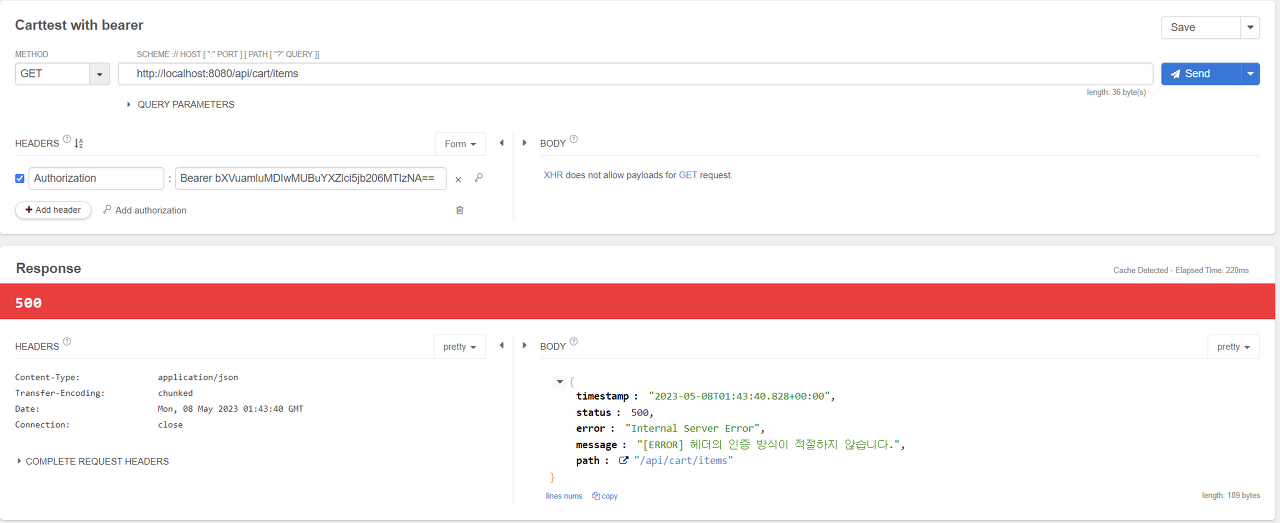 다음처럼 basic 방식이 아닌 bearer 방식으로 Authorization 헤더를 구성해서 보냈을 때와 헤더에 Authorization 값이 없는 경우 우리가 작성해준 예외 메세지가 잘 반환됨을 확인할 수 있다. 하지만 이렇게 클라이언트에게 예외 응답 메세지를 보내는 데에는 몇가지 문제점이 있다.