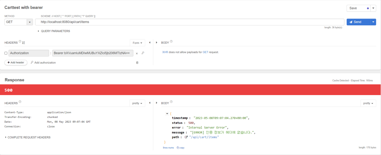 - 서버측에서 예외를 처리해서 응답메세지를 보냈음에도 응답 메세지의 ststus가 500이고 Internal Server Error가 발생했다고 전달되고 있다. 이 때 클라이언트 입장에서 이 응답 메세지가 서버측에서 예외를 잘 처리해서 넘겨준 응답 메세지인지, 아니면 서버측에서 처리하지 못하는 예상치 못한 문제로 인해 전달된 응답 메세지인지 알 수 없게 된다.(물론 이 경우 message 내용을 확인하면 어느정도 의도된 예외 응답이 반환되었는지 알 수 있겠으나 이 부분에도 문제가 있는데 다음 항목에서 후술한다.)