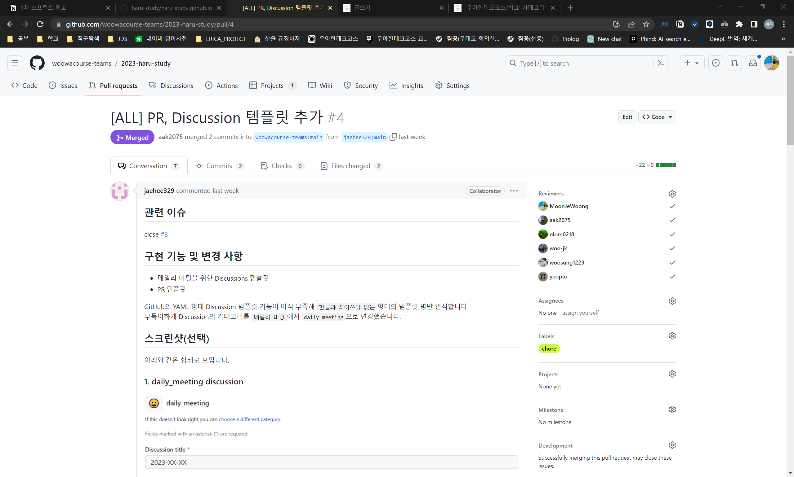 - 해결책 : 반드시 팀 전체의 의견이 하나로 수렴되지 않아도 되는 안건에 대해서는 일부 크루가 결정을 해오면 일단 그것을 따르면서 필요한 부분을 수정해나가는 방식으로 변경했다.