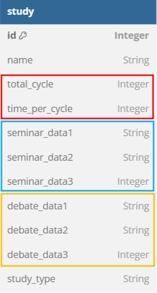 그러면 위와 같이 새롭게 추가된 세미나와 토론 방식의 데이터를 관리하기 위한 column들의 추가가 이뤄질 것입니다. 각각 빨간색, 하늘색, 노란색으로 구분된 column들이 보이시나요? 만약 서비스에서 뽀모도로 방식의 스터디가 새로 개설된다면, 세미나와 토론 방식 스터디 데이터에 해당하는 하늘색과 노란색 영역 데이터들이 전부 null 상태로 저장이 될 것입니다.
