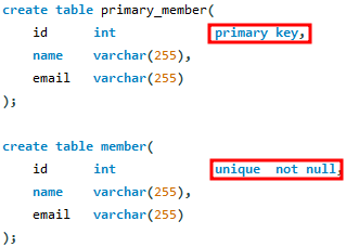 - 하나의 데이터 컬럼에 Not Null, UNIQUE 제약 조건을 한 번에 같이 걸어주면 됩니다.
