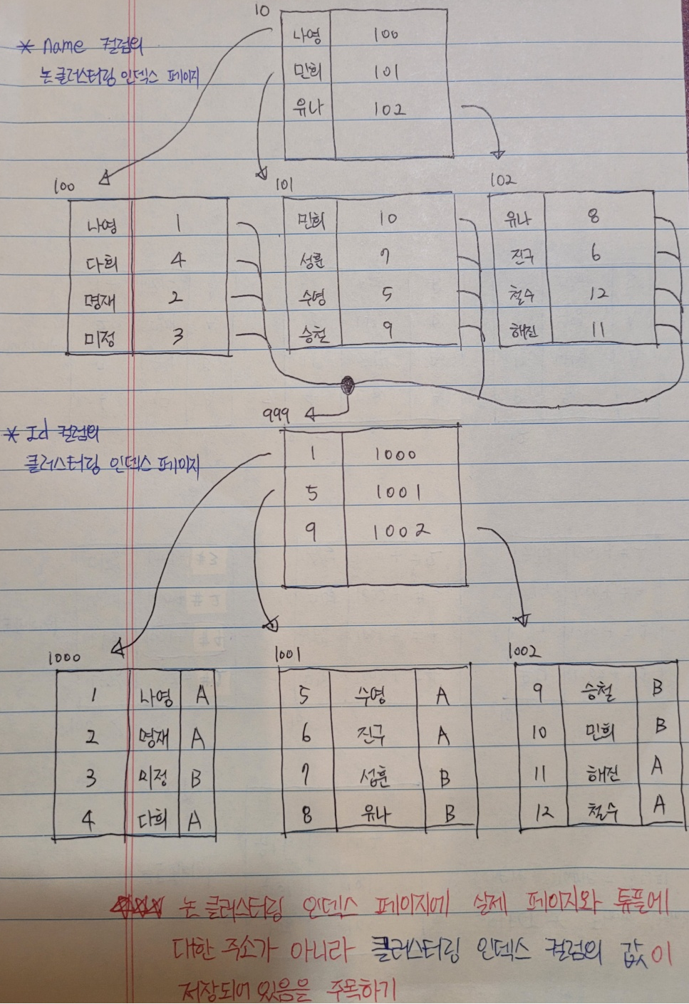 - 클러스터링 인덱스는 실제 데이터가 정렬되어 리프 페이지가 곧 데이터 페이지와 동일하게 관리되었습니다.