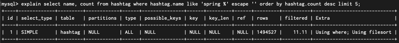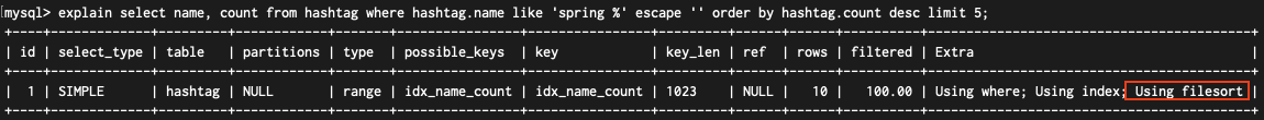 현재 사용하는 쿼리의 실행계획을 살펴보면, Extra 컬럼에 Using filesort가 표시되고 있습니다. 이는 hashtag 테이블에 대한 해당 쿼리를 처리하고자 할 때 사용할 수 있는 적절한 인덱스가 존재하지 않기 때문에 별도의 정렬용 버퍼에 레코드를 복사해서 정렬하고 결과를 반환한다는 것을 의미합니다.