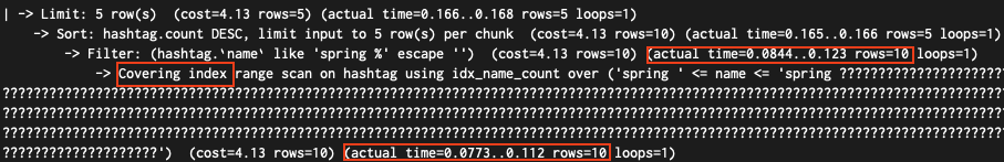 - 이러한 이유 때문에, 해시태그를 입력하기 위해 첫 글자를 입력했을 때 가장 정렬과정에서 오래 시간이 소요될 것이라고 예측했는데요, 실제로 실행계획 살펴보면 's'라고 입력했을 때 가장 오래 걸리고 'spring %' 이런 식으로 단어가 완성되어 갈수록 더 시간이 단축되어가는 것을 확인할 수 있습니다. 이는 글자를 하나만 입력했을 때 정렬해야 하는 레코드의 양이 가장 많기 때문입니다.