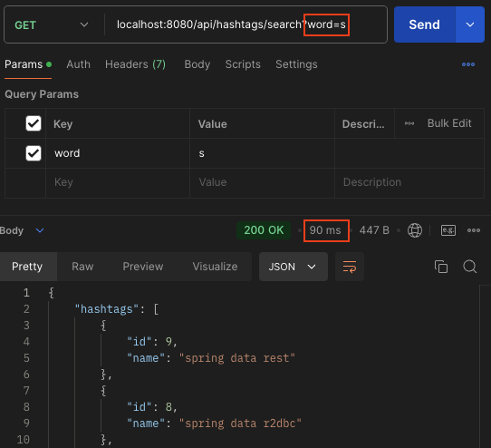 이렇게 해서 해시태그 검색어 자동완성 기능에 대한 1차적인 성능 개선 작업을 완료했습니다. 하지만 마지막에 언급했다시피 잠재적인 문제점과 한계점이 여전히 존재하고 있다는 점이 아쉽습니다. 물론 저희 프로젝트 서비스 차원에서는 이미 충분히 사용할만한 API라고 생각합니다만, 당장 떠오르는 문제점은 백엔드 차원에서 최대한 해결해보고자 합니다. 그래서 다음 포스팅에서는 이런 점을 고려해서 API를 개선해보도록 하겠습니다.