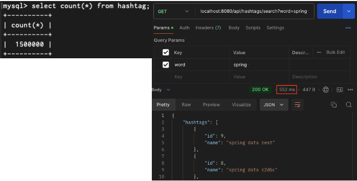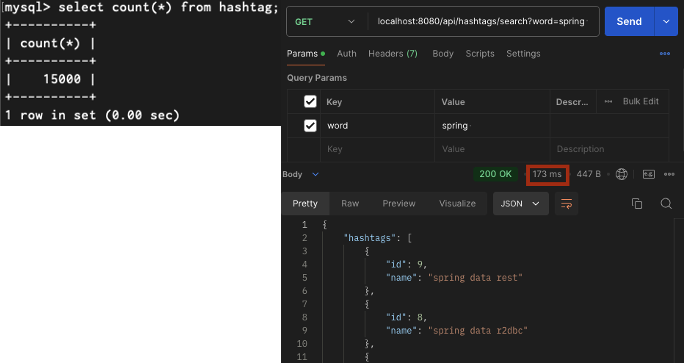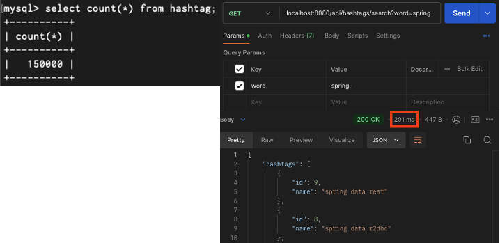 15건의 hashtag 레코드에 대해서는 처음 정했었던 100ms 이내의 성능을 만족해야 한다는 요구사항을 충족시킬 수 있었습니다. 그러면 이제 점진적으로 hashtag 레코드 개수를 늘려가며 성능 측정을 해보겠습니다. (구체적인 이미지는 접은 글을 펴주시면 보실 수 있습니다.)