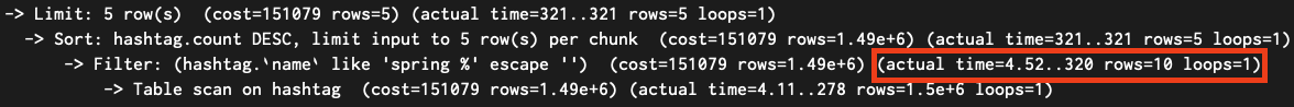 EXPLAIN ANALYZE를 통해 실제 쿼리 수행과정을 살펴보면 해시태그 중 주어진 문자열을 prefix로 가지는 레코드를 탐색하기 위해 테이블을 풀스캔하며 filtering하는 과정에서 시간이 가장 많이 소요됨을 확인할 수 있었습니다. 현재 입력된 150만개의 해시태그 데이터의 name 컬럼에는 의미를 갖지 않는 무작위 문자열이 입력되었기 때문에 'spring ' 이라는 문자열을 prefix로 가지는 해시태그를 필터링한 이후 정렬과정에서는 레코드 개수가 많지 않아 1ms 이내에 종료된 것을 확인할 수 있었습니다. (나중에 해당 부분이 잠재적인 문제 요인이 될 수 있다는 내용은 뒤에서 다뤄보도록 하겠습니다.)