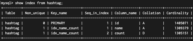 이를 통해 hashtag 테이블을 스캔하며 name 컬럼 값을 검사할 때 사용할 수 있는 인덱스를 생성해준다면 유의미한 성능 개선을 이뤄낼 수 있을 것이라는 근거를 얻을 수 있었습니다.