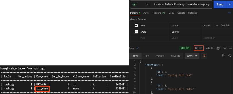hashtag 테이블의 name 컬럼에 인덱스를 생성해준 뒤 성능 측정을 해보았습니다.