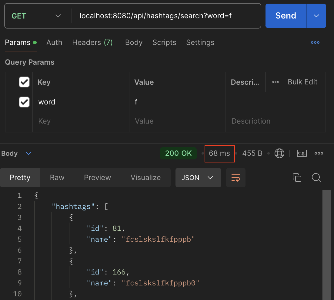 10만 건의 해시태그 데이터에 대해서 약 68ms를 기록했던 기존 성능에 비해 지금은 캐싱 데이터를 바로 조회해오기 때문에 7ms 이내로 처리를 완료하는 것을 확인할 수 있었습니다. 물론 캐시 미스가 발생했을 때는 DB를 조회하는 과정에서 다시 성능이 튈수도 있지만, 해당 값 또한 다시 캐싱될 것이기 때문에 적어도 그 하루동안은 동일한 요청에 대해 다시 캐시 미스가 발생하지 않게 됩니다.