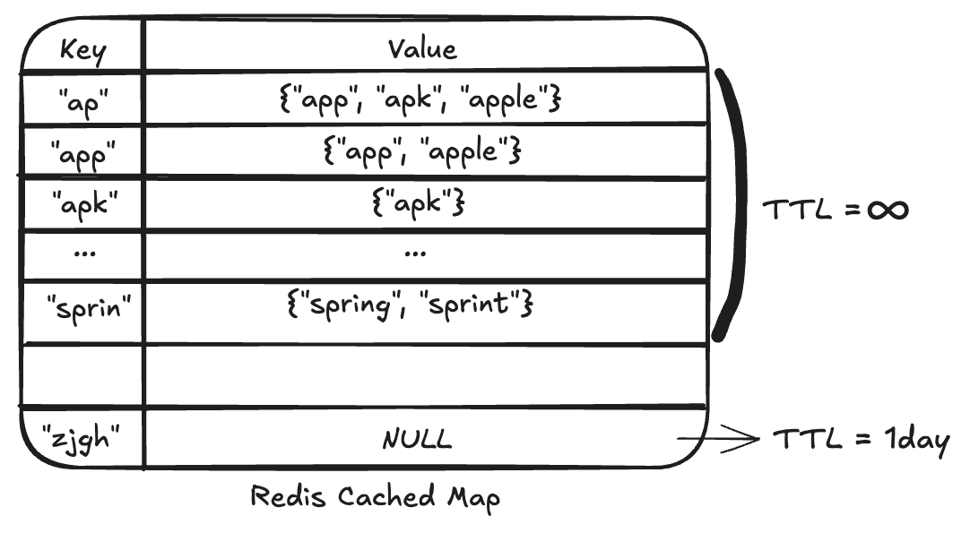 그래서 DB에 존재하는 해시태그 데이터들을 기준으로 만들 수 있는 검색 단어 후보군에 대해서만 캐싱을 하는 방향으로 전략을 설계하고자 했습니다. 여기에서 고민 포인트는 "어떻게 이 검색 단어 후보군을 만들어야할까?" 였습니다. 단순하게 생각해보면 각 해시태그 값을 읽어서 만들 수 있는 prefix 단어 별로 set 자료구조에 넣어가며 완성시켜가는 방법을 사용해볼 수 있을 것 같았습니다. 하지만 이후에 각 prefix 단어별로 응답 값을 캐싱하는 과정에서 매번 DB 요청을 통해 응답을 캐싱해야 한다고 생각하니 한번의 캐싱용 map을 생성하는데 너무 큰 네트워크 비용과 DB 부하가 발생할 것이라고 생각했습니다.